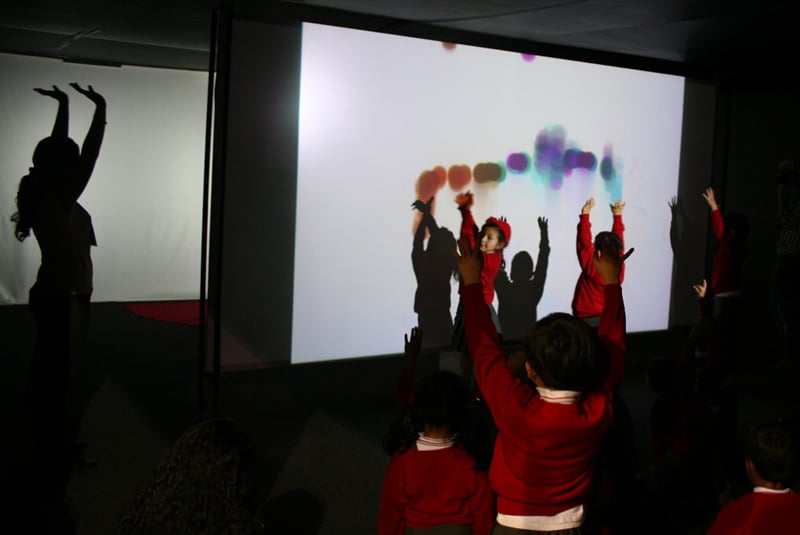 Description Desarrollo, por encargo, de la instalación interactiva para el pabellón infantil del festival internacional de arte de Bogotá – ArtBo 2010. En esta los niños crean sus propios performances, estimulados por una interfaz de partículas coloridas que reaccionan a sus gestos corporales.
