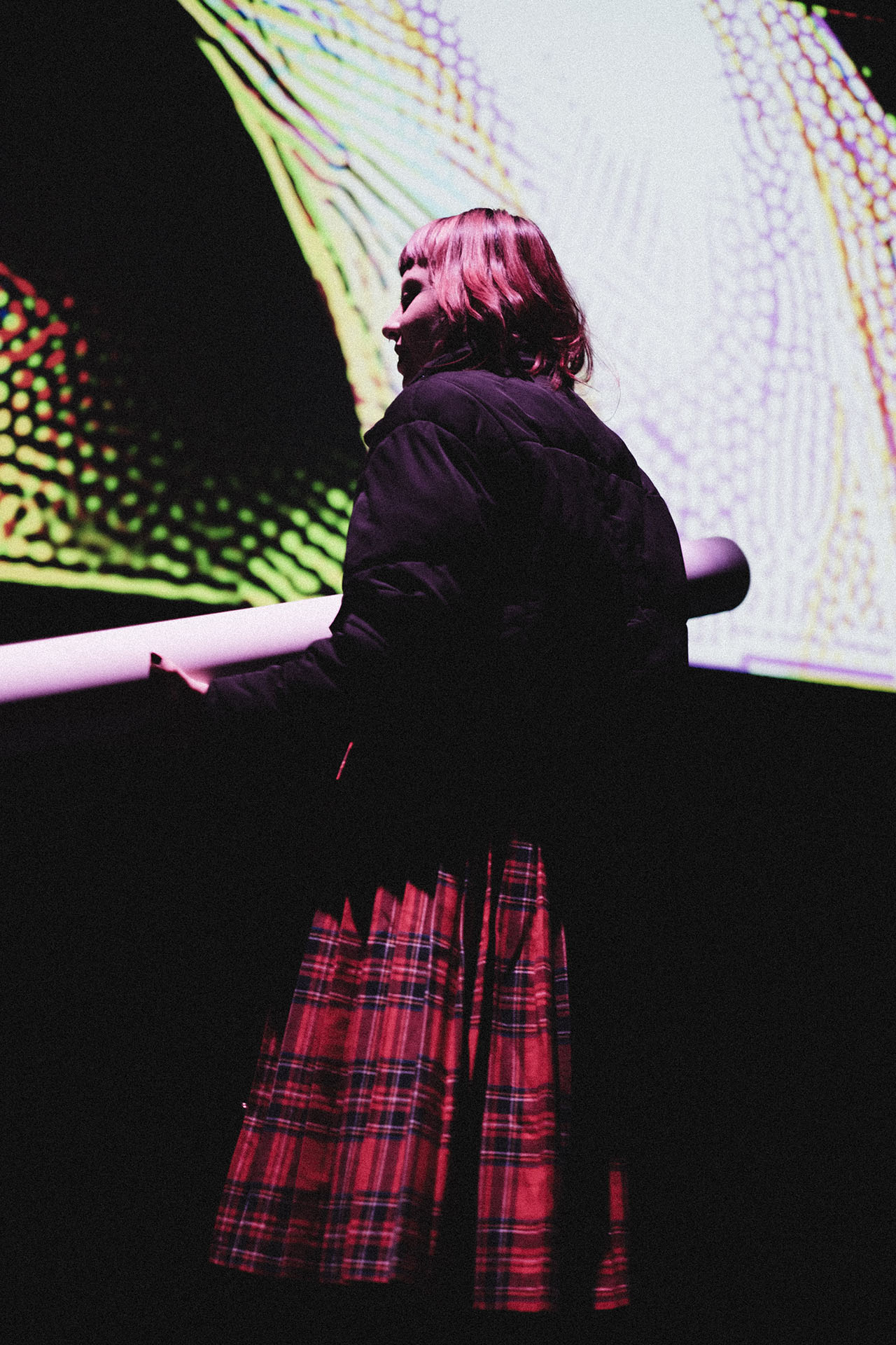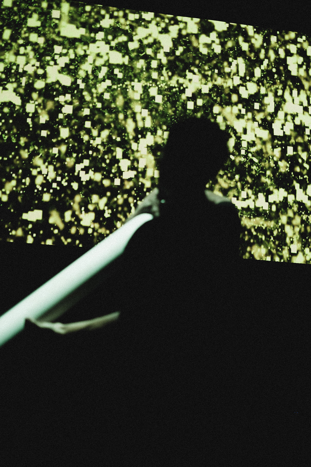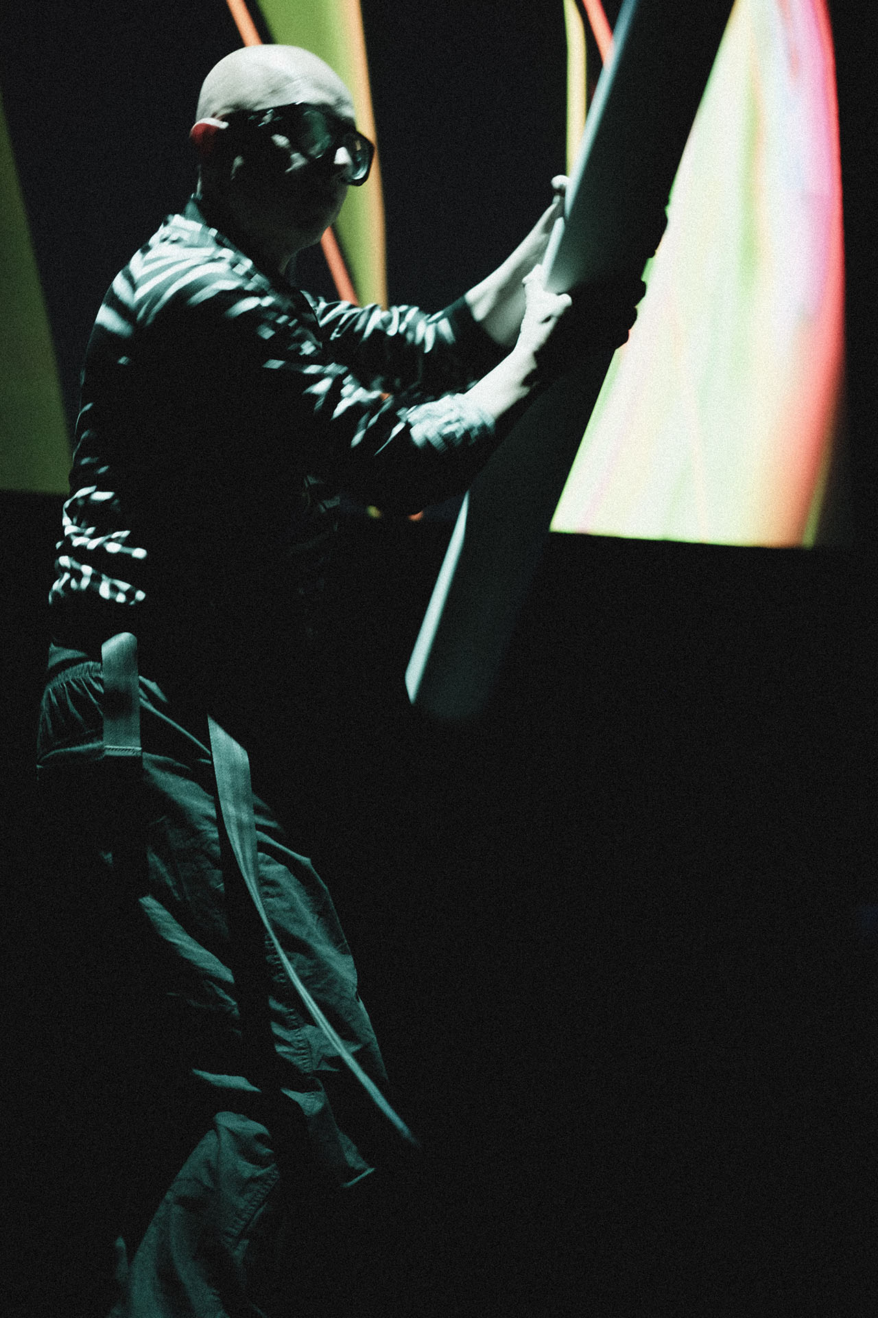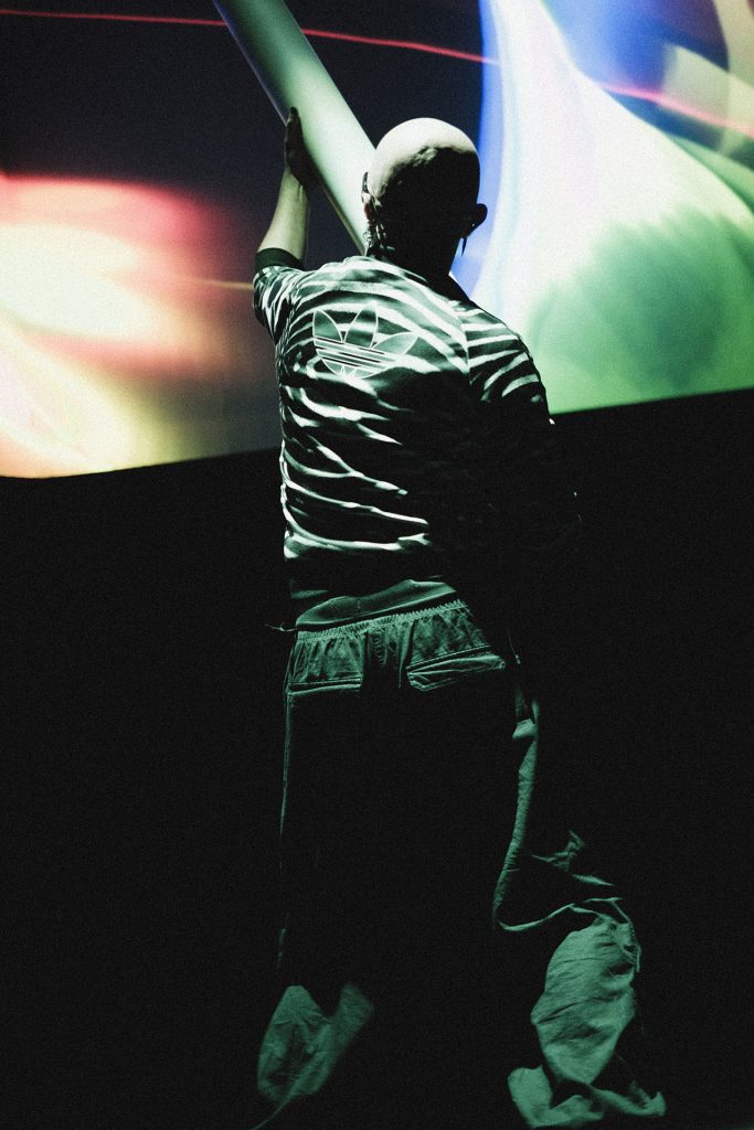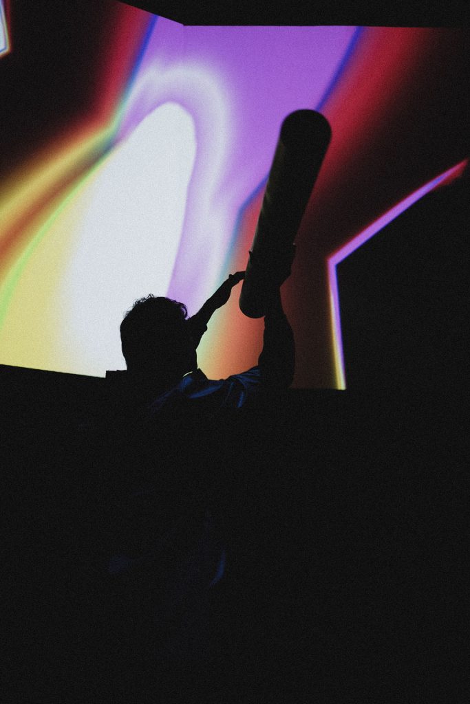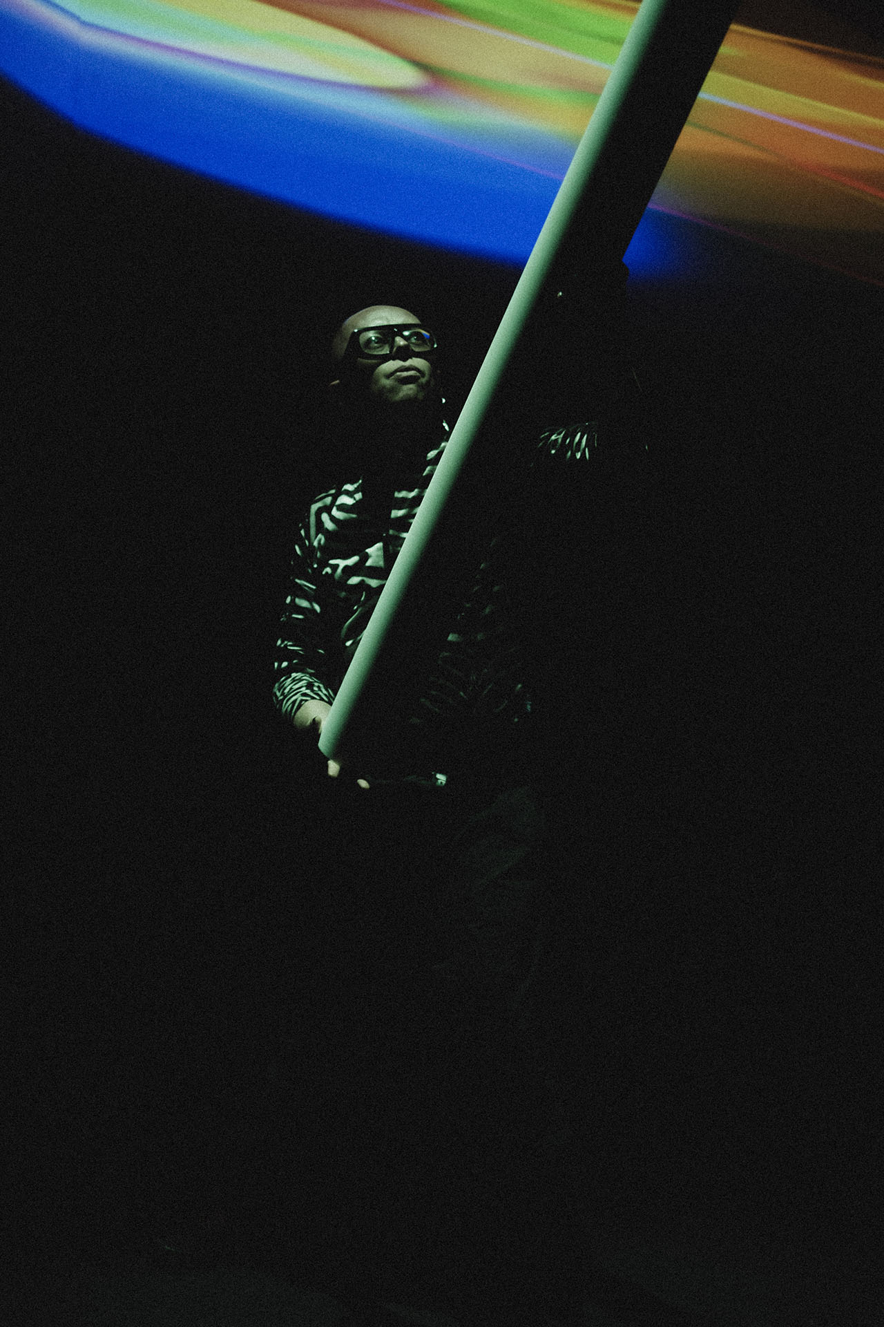 The defining highlight of the show at La Cinemateca was the organic dissolution of the boundary between the stage and the audience. During the second phase of the set, a group of more than 20 spectators spontaneously transitioned from the seating area to the stage. This collective of “spectator-creators” began passing the instrument between one another, using its weight and reactive feedback to drive their own dance and movement. In this moment, the performance was no longer a solo act; it became a self-organizing community display where the public took full authorship of the audiovisual environment, performing for one another in a vibrant, shared ritual.