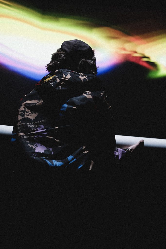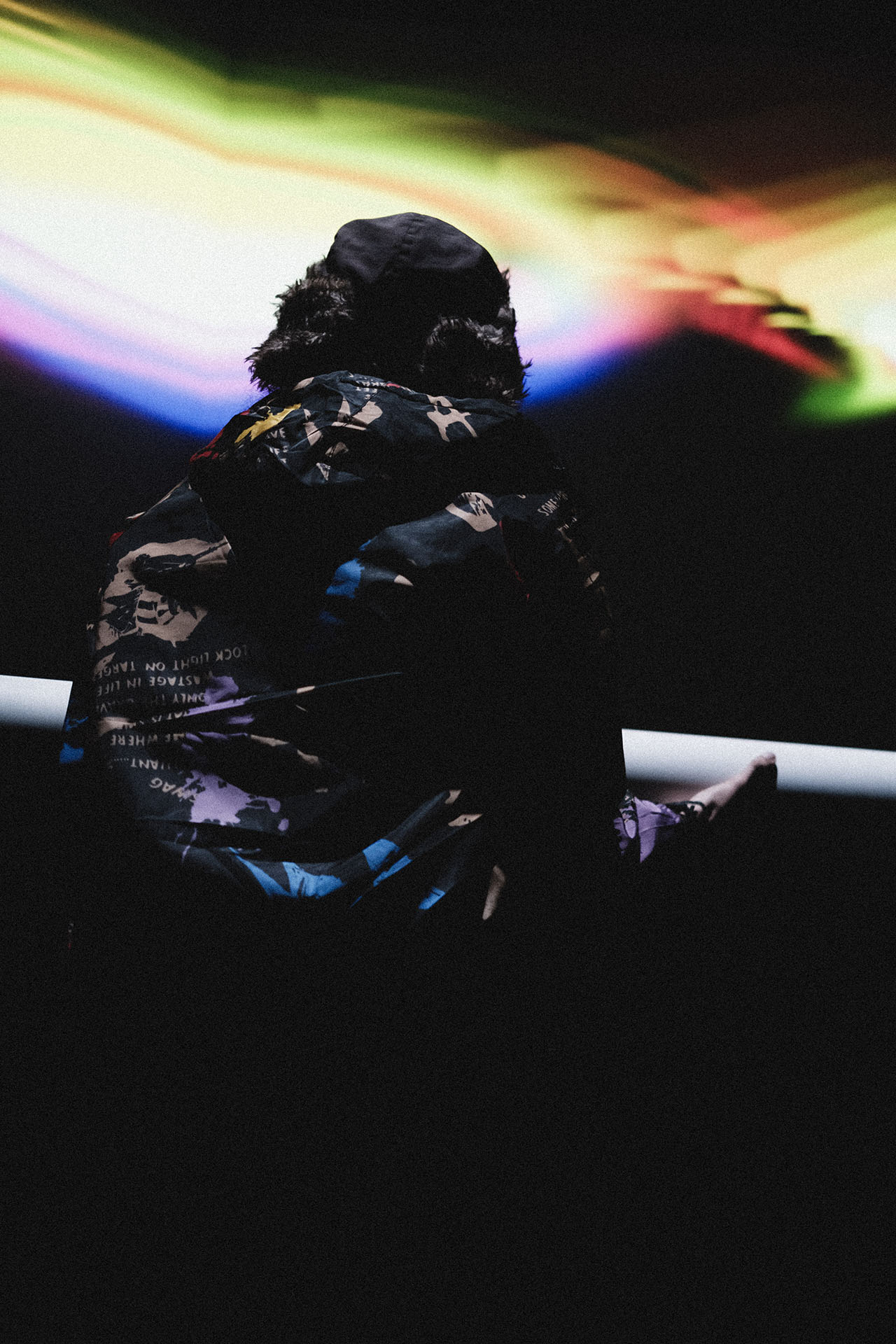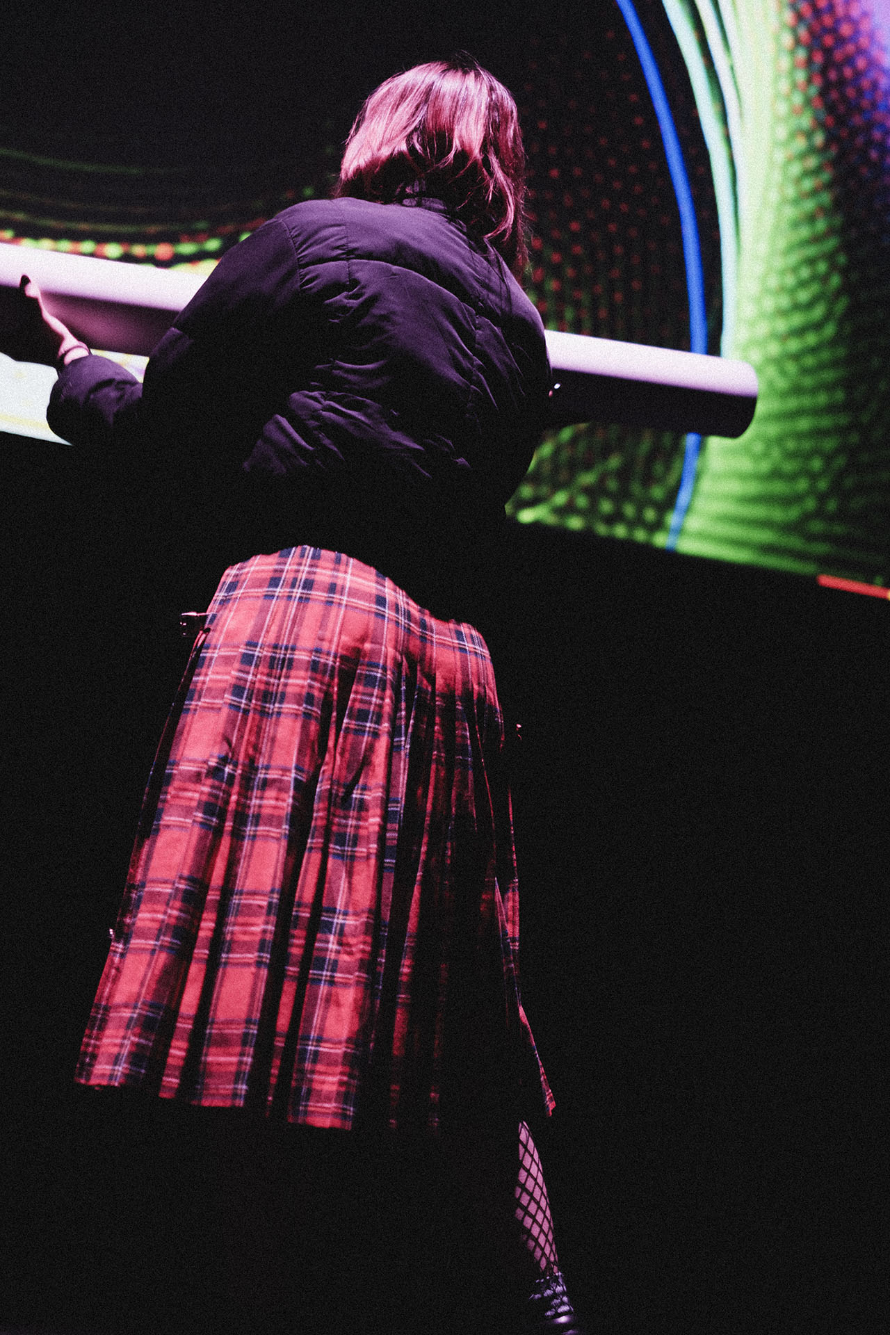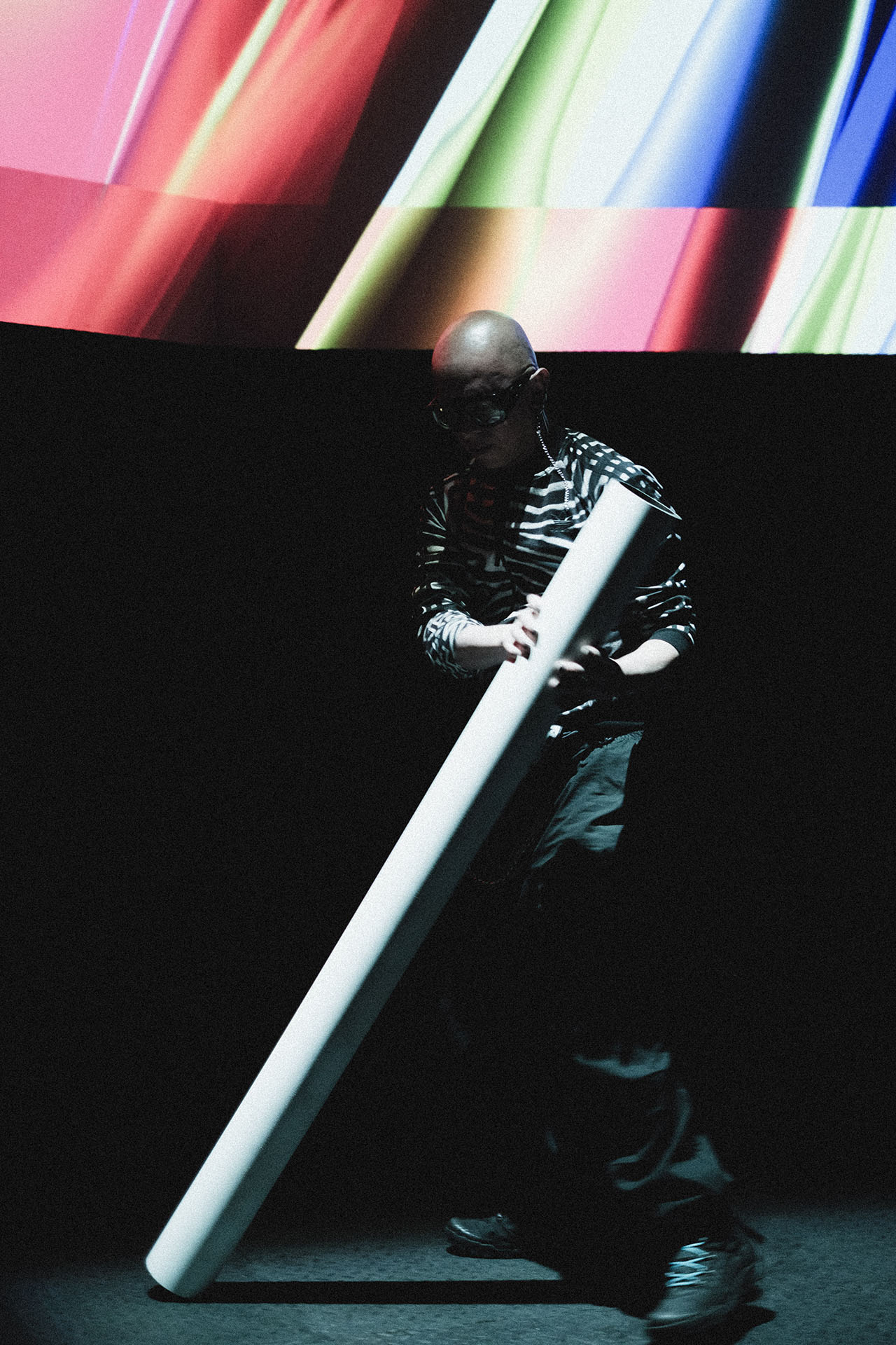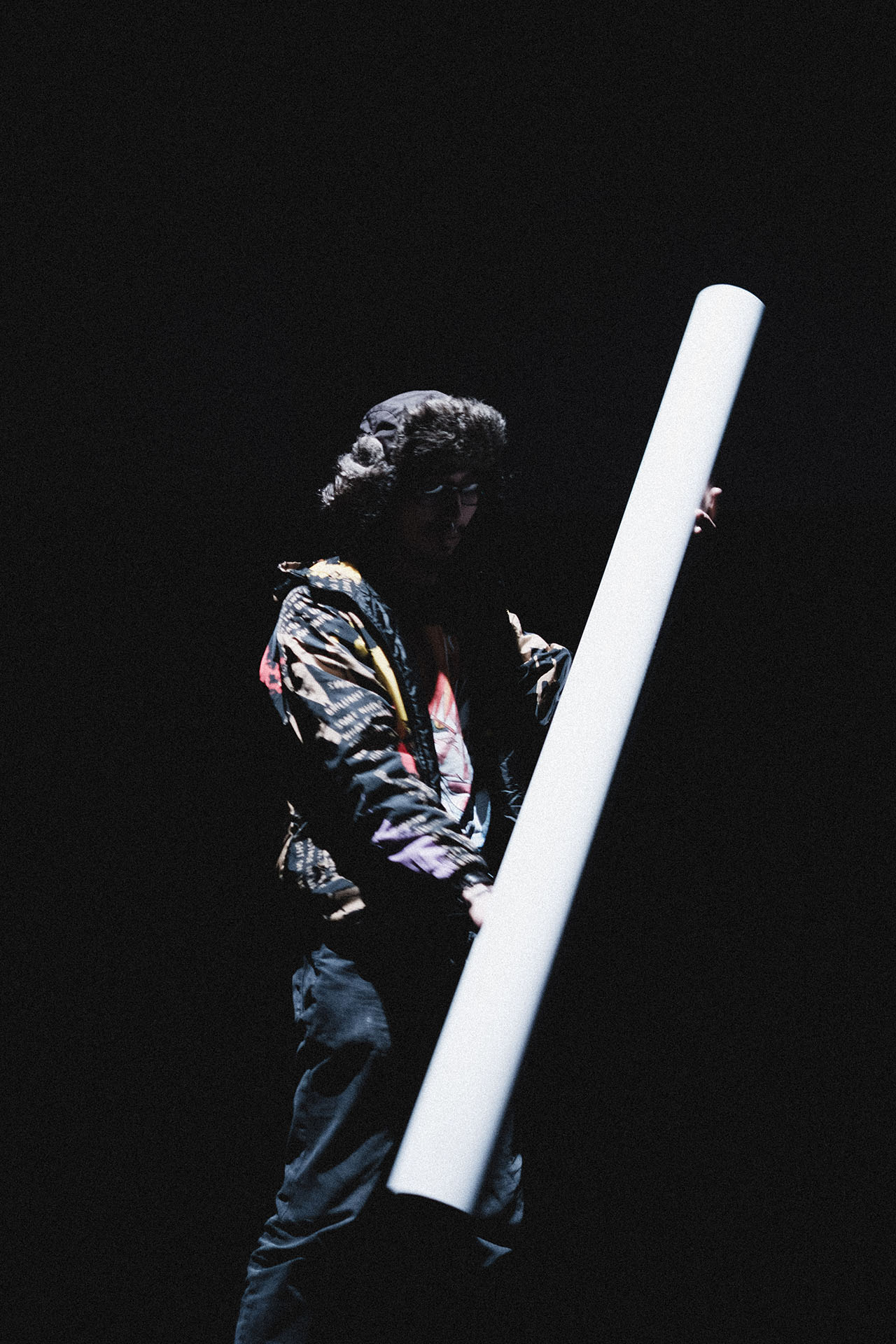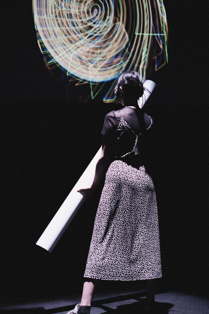 The defining highlight of the show at La Cinemateca was the organic dissolution of the boundary between the stage and the audience. During the second phase of the set, a group of more than 20 spectators spontaneously transitioned from the seating area to the stage. This collective of “spectator-creators” began passing the instrument between one another, using its weight and reactive feedback to drive their own dance and movement. In this moment, the performance was no longer a solo act; it became a self-organizing community display where the public took full authorship of the audiovisual environment, performing for one another in a vibrant, shared ritual.